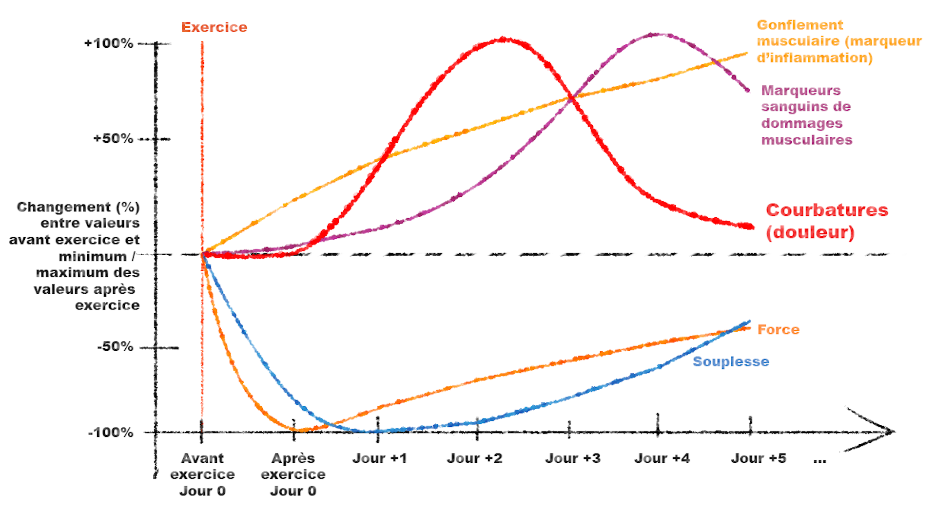 En revanche, ces microlésions entraînent une cascade de phénomènes physiologiques durant les heures et jours suivant l’exercice physique intense ou inhabituel. Certains de ces phénomènes sont quasi immédiats, comme la fuite de composants, notamment des enzymes et des protéines contenues dans la cellule musculaire qui diffusent vers l’extérieur des membranes cellulaires endommagées. D’autres sont plus tardifs, comme les réactions inflammatoires et immunitaires, qui peuvent s’étaler sur plusieurs jours, voire plusieurs semaines.).